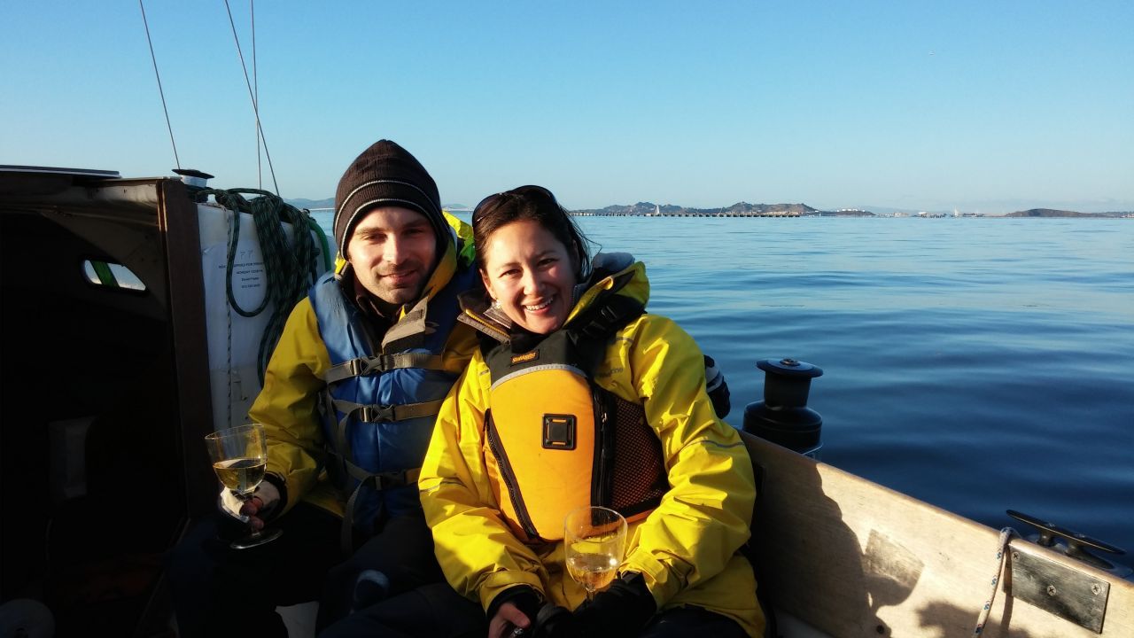 This was the nightmare scenario. As it turned out, on a recent Monday, Anthony Lunnis, Paco Bellam, and I picked up CSC Senior Skipper Nathan Ilten and his guest Robyn Gee at San Francisco's Pier 1.5 and headed back to Berkeley without incident or wind, silencing the motor as we slipped past the Bay Bridge on a glassy sea as he proposed and she accepted on the foredeck of Portugal Princess.