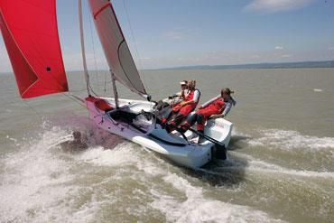 Another useful tool for keeping the boat flat is the main sheet. The skipper should actively work the sheet, not only for sail trim, but to compensate for gusts and lulls by respectively sheeting out and in. Finally, it is also important for skipper and crew to shift their weight aft. This will help the boat get planing and prevent it from doing a nosedive, which could lead to a broken mast.