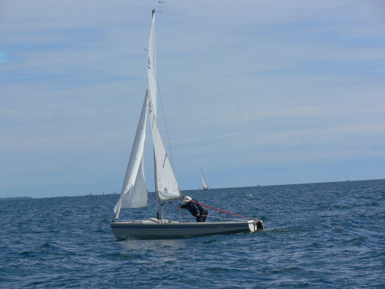 • Get on a dead run. Get the jib to cross to the center of the boat and try to keep it there. Watch out for the accidental gybe, and tell your crew to do the same. If you have crew you may want to have someone hold the boom in place to avoid a gybe before you're ready.  They'll also be able to feel the main starting to get back-winded, so they can let you know you've turned too far off the wind.  Maintaining a dead-run can in-itself be tricky, and if you can hold this reasonably well in waves, you're off to a good start!